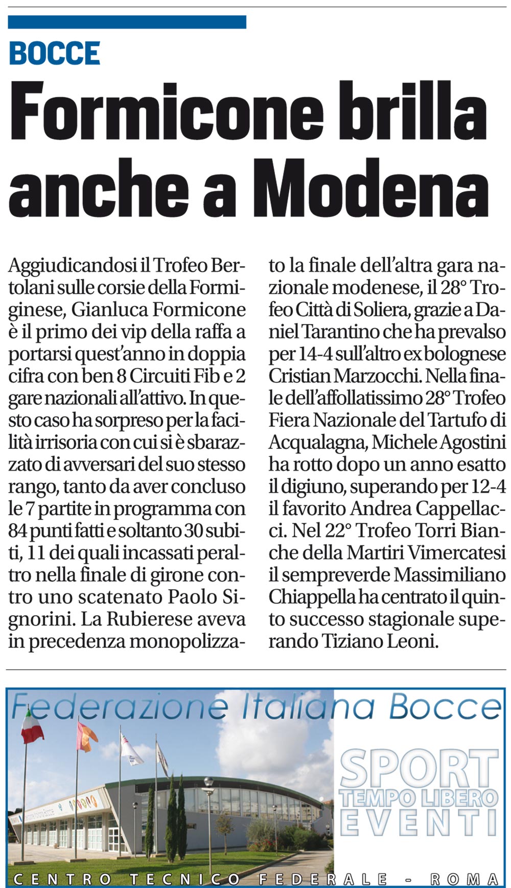Espandi l'inventario Genera il QR Code della scheda Copia il permalink 11-nov-01 Tipologia Documento Data cronica 11/11/2014 Rassegna StampaArchivioDocumento Tipologia pubblicazioni quotidiani inserzioni pagine webContenuto circuito FIB raffaLink esterni https://www.federbocce.it/multimedia/rassegna-stampa/corriere-dello-sport/2014-3/890-11-novembre-1-6/file.html Serie