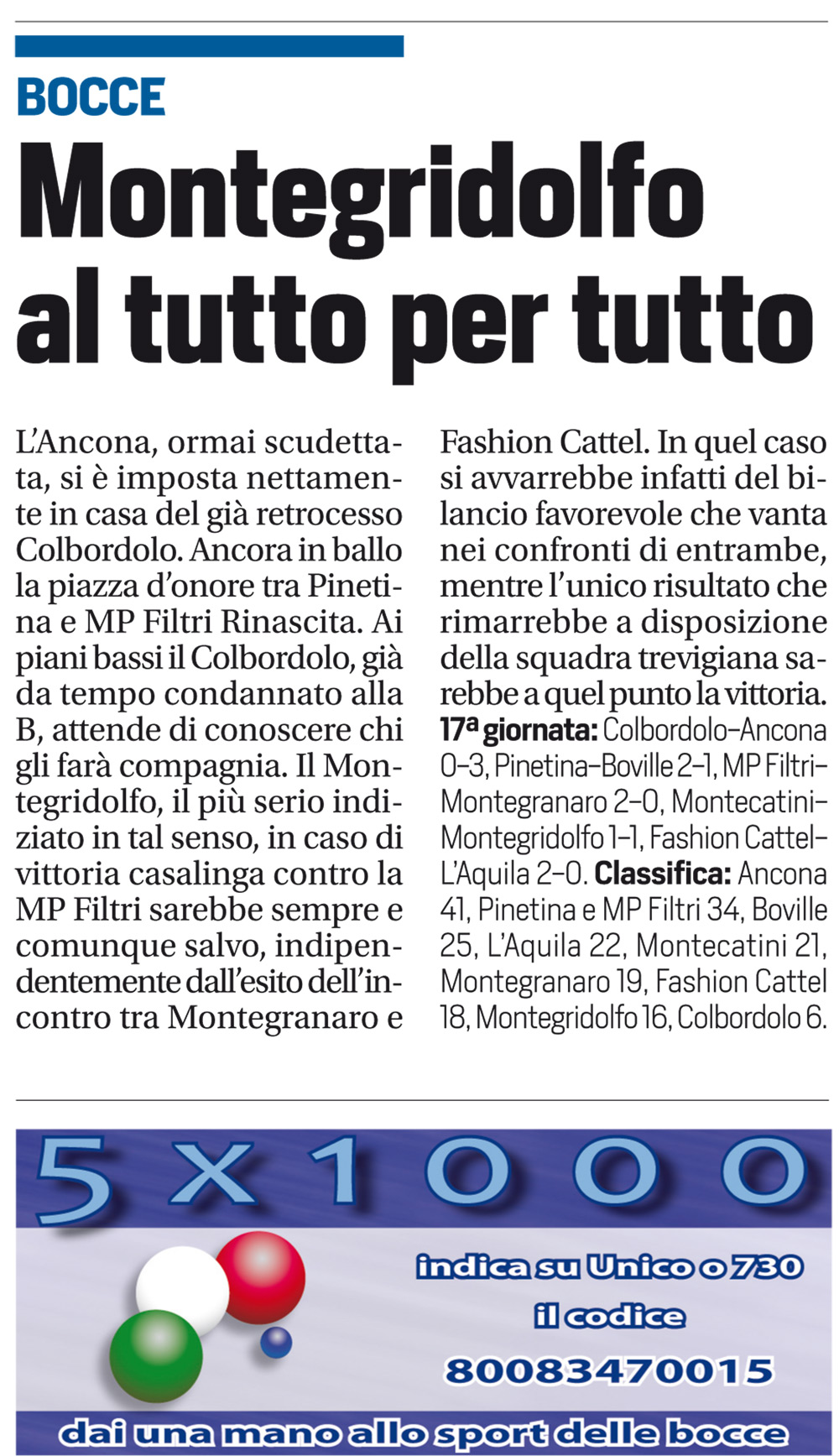 Espandi l'inventario Genera il QR Code della scheda Copia il permalink 05-mag-02 Tipologia Documento Data cronica 05/05/2014 Rassegna StampaArchivioDocumento Tipologia pubblicazioni quotidiani inserzioni pagine webContenuto serie A raffaLink esterni https://www.federbocce.it/multimedia/rassegna-stampa/corriere-dello-sport/2014-3/886-05-maggio-2-6/file.html Serie