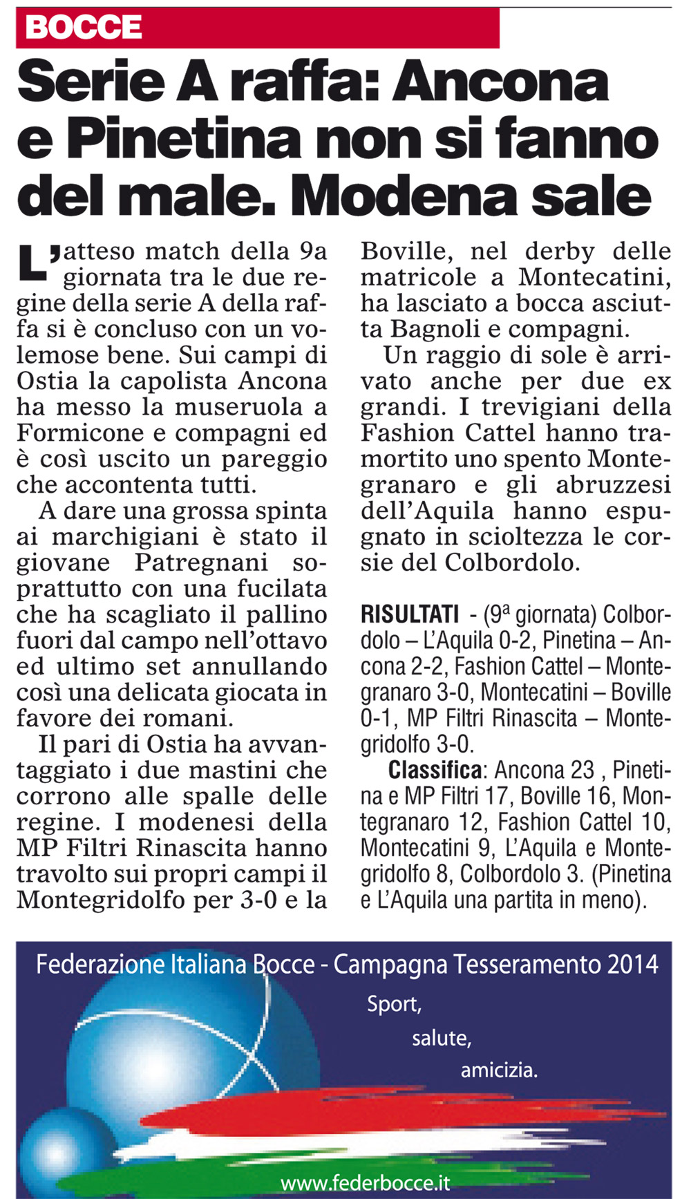 Espandi l'inventario Genera il QR Code della scheda Copia il permalink 02-feb-02 Tipologia Documento Data cronica 02/02/2014 Rassegna StampaArchivioDocumento Tipologia pubblicazioni quotidiani inserzioni pagine webContenuto serie A raffaLink esterni https://www.federbocce.it/multimedia/rassegna-stampa/corriere-dello-sport/2014-3/876-02-febbraio-2-7/file.html Serie