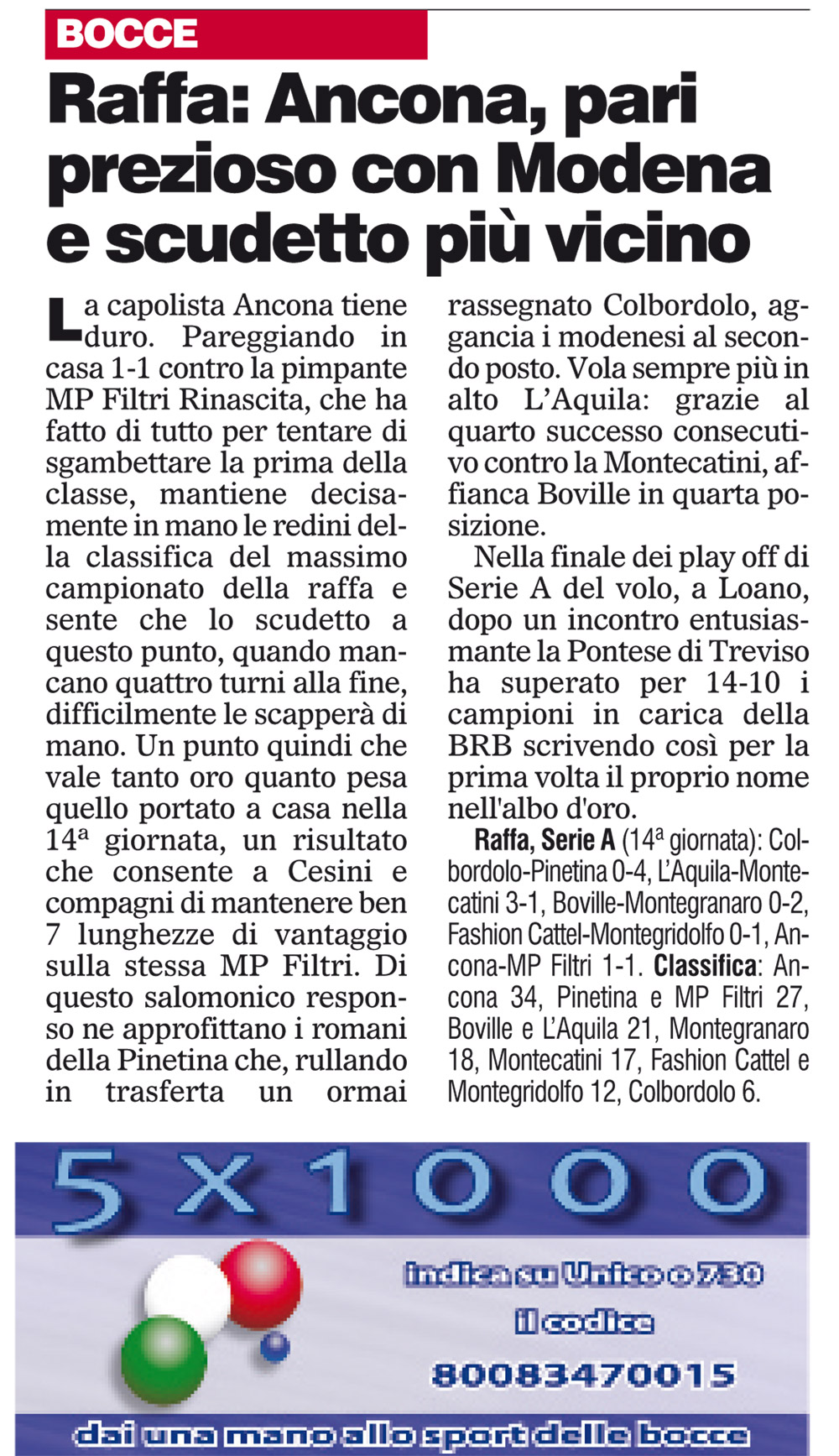 Espandi l'inventario Genera il QR Code della scheda Copia il permalink 03-mar-04 Tipologia Documento Data cronica 03/03/2014 Rassegna StampaArchivioDocumento Tipologia pubblicazioni quotidiani inserzioni pagine webContenuto serie A raffaLink esterni https://www.federbocce.it/multimedia/rassegna-stampa/corriere-dello-sport/2014-3/871-03-marzo-4-7/file.html Serie