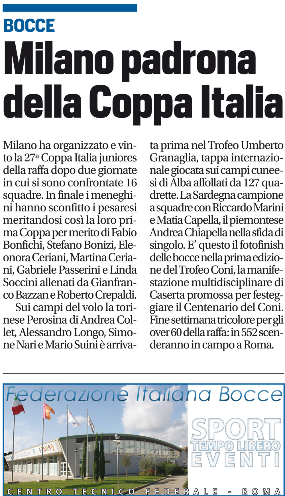 Espandi l'inventario Genera il QR Code della scheda Copia il permalink 10-ott-03 Tipologia Documento Data cronica 10/10/2014 Rassegna StampaArchivioDocumento Tipologia pubblicazioni quotidiani inserzioni pagine webContenuto coppa italia juniores raffaLink esterni https://www.federbocce.it/multimedia/rassegna-stampa/corriere-dello-sport/2014-3/867-10-ottobre-3-6/file.html Serie