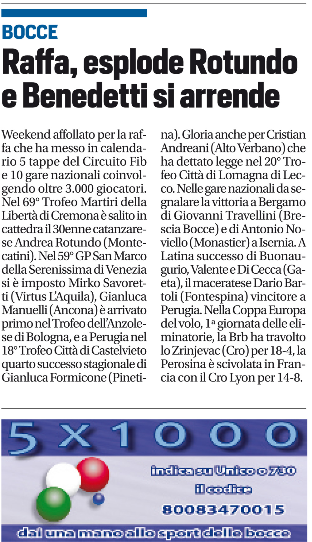 Espandi l'inventario Genera il QR Code della scheda Copia il permalink 05-mag-01 Tipologia Documento Data cronica 05/05/2014 Rassegna StampaArchivioDocumento Tipologia pubblicazioni quotidiani inserzioni pagine webContenuto circuito FIB raffaLink esterni https://www.federbocce.it/multimedia/rassegna-stampa/corriere-dello-sport/2014-3/861-05-maggio-1-7/file.html Serie