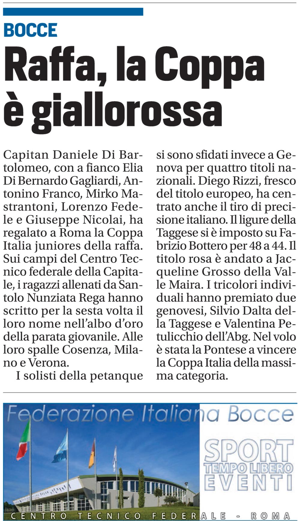 Espandi l'inventario Genera il QR Code della scheda Copia il permalink 10-ott-03 Tipologia Documento Data cronica 10/10/2015 Rassegna StampaArchivioDocumento Tipologia pubblicazioni quotidiani inserzioni pagine webContenuto coppa italia juniores raffaLink esterni https://www.federbocce.it/multimedia/rassegna-stampa/corriere-dello-sport/2015-3/925-10-ottobre-3-7/file.html Serie
